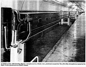 A section of the 1000 Bending Magnets, manufactured by Morfax Ltd., positioned around the 7km (4.5 mile) circumference tunnel of the Super Proton Synchnotron at CERN, Geneva.