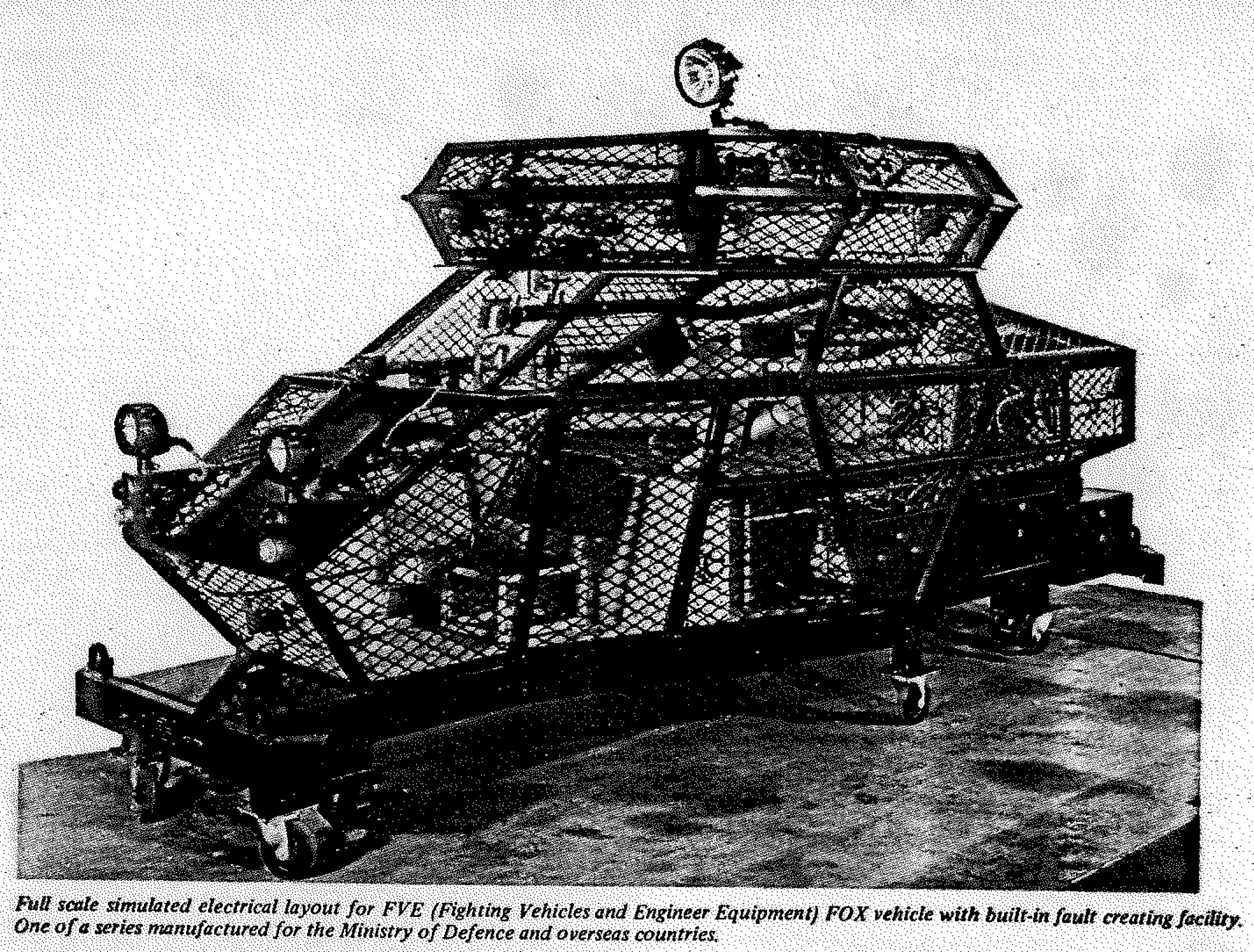 Full scale simulated electrical layout for FVE (Fighting Vehicle and Engineer Equipment) FOX vehicle with built-in fault creating facility. One of a series manufactured for the Ministry of Defence and overseas countries.