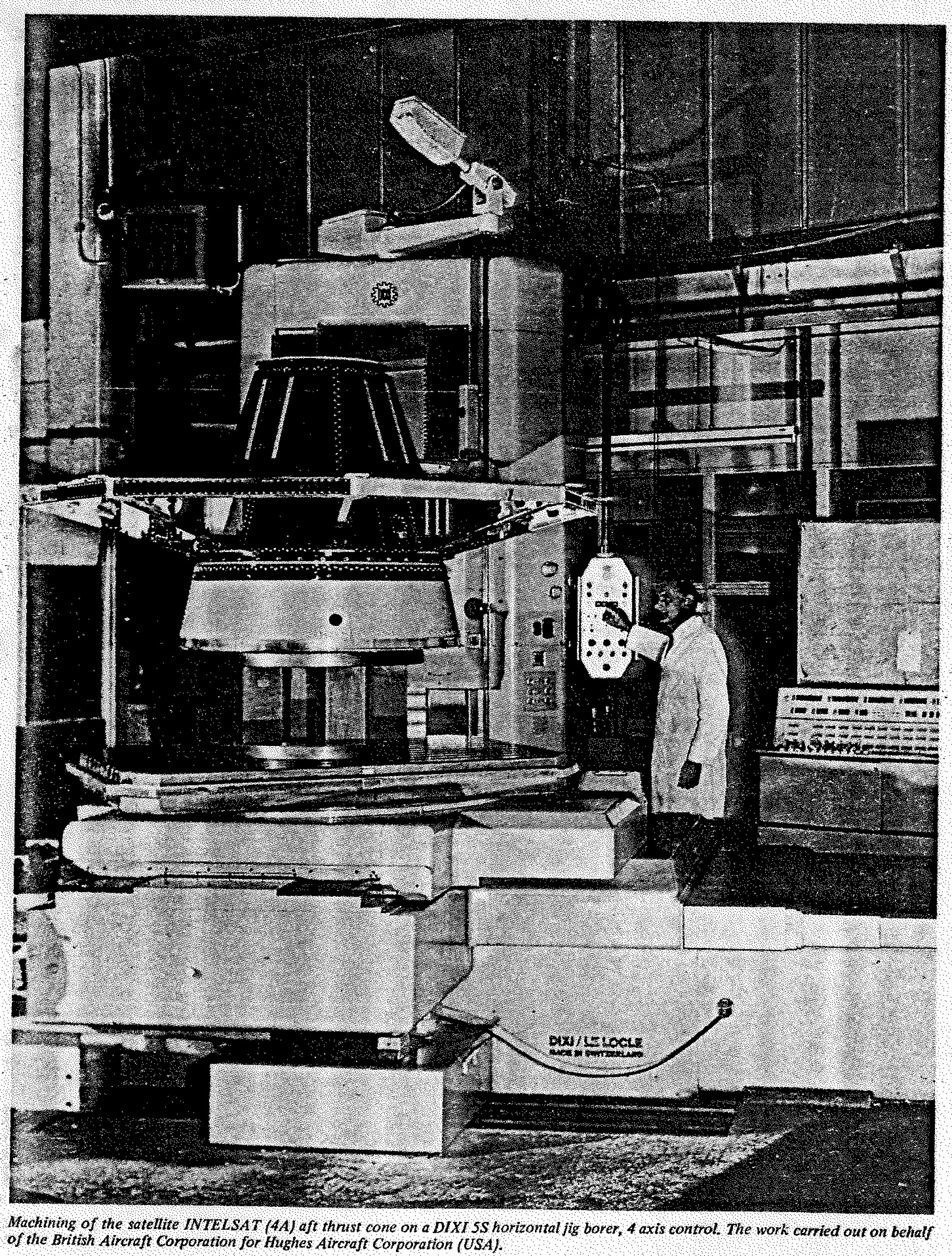 Machining of the satellite INTELSAT (4A) aft thrust cone on a DIXI 5S horizontal jig borer, 4 axis control. The work carried out on behalf of the British Aircraft Corporation for Hughes Aircraft Corporation (USA).