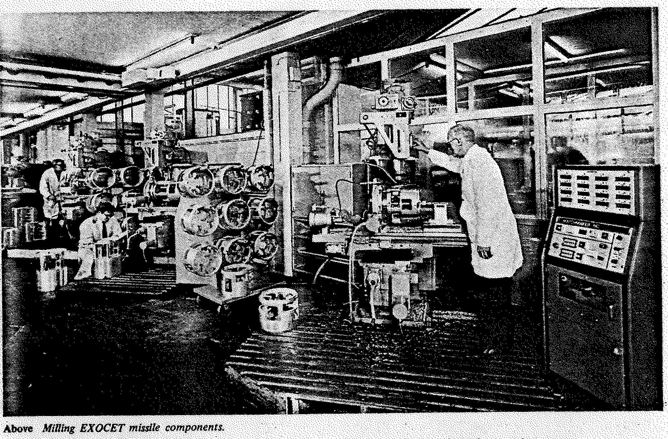 Many of the machine tools to be used have been developed specially by Morfax for the Exocet programme. Typical of these is a four-headed, seven-axis unit which performs the complete machining operations on the launching ramp. The company’s interest in the weapon is comprehensive, making as it does parts for both the missile and its launcher.