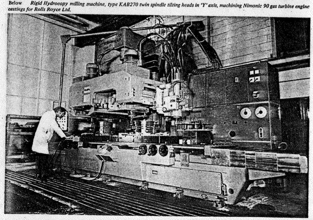 Rigid Hydrocopy milling machine, type KAB270 twin spindle tilting heads in ‘Y’ axis, machining Nimonic 90 gas turbine engine castings for Rolls Royce Ltd.