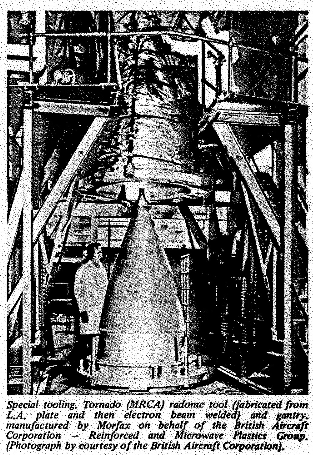 Special tooling. Tornado (MRCA) radome tool (fabricated from L.A. plate and then electron beam welded) and gantry, manufactured by Morfax on behalf of the British Aircraft Corporation – Reinforced and Microwave Plastics Group.