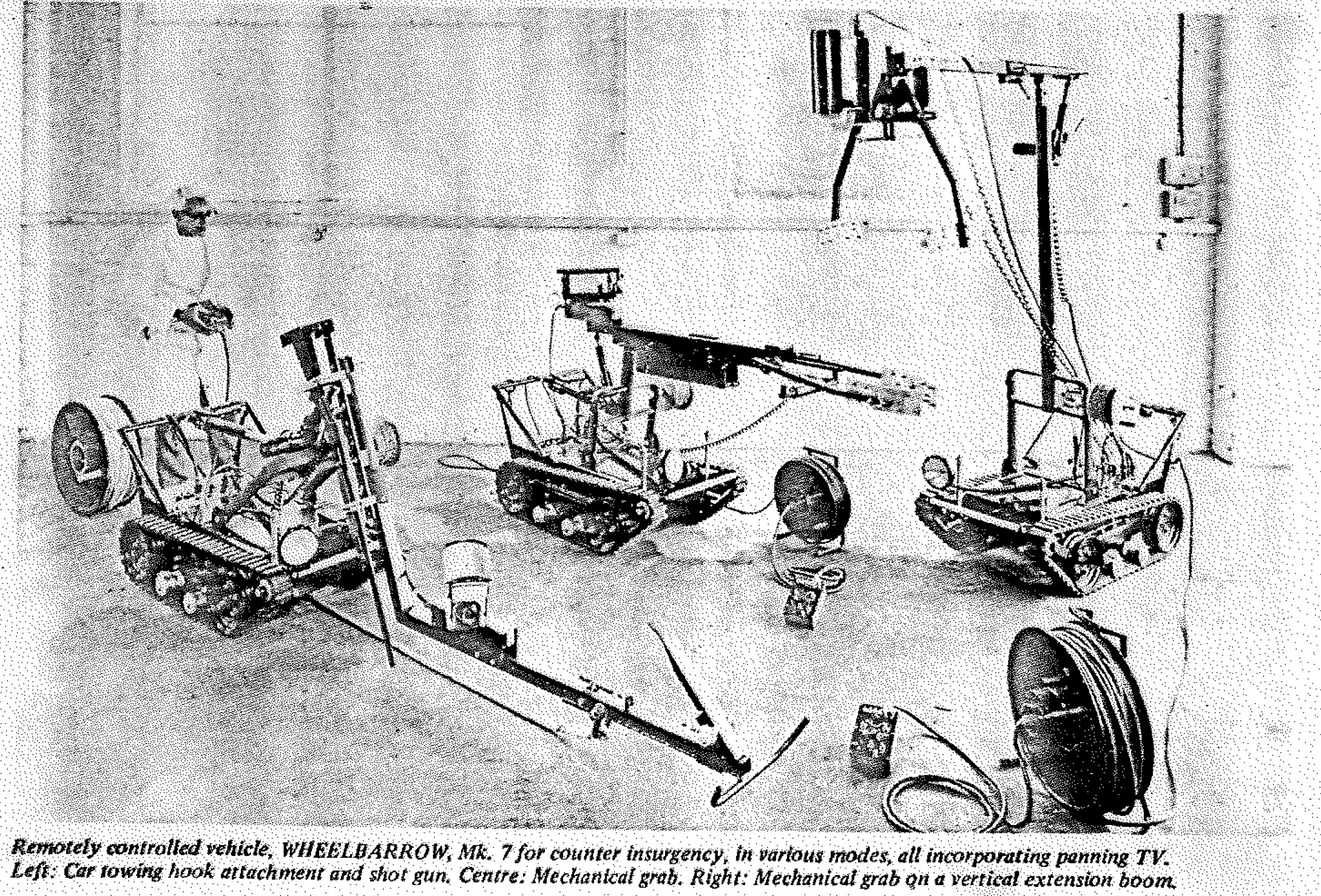 Remotely controlled vehicle, WHEELBARROW, Mk. 7 for counter insurgency, in various modes, all incorporating panning TV. Left: Car towing hook attachment and shot gun. Centre: Mechanical grab. Right: Mechanical grab on a vertical extension boom.
