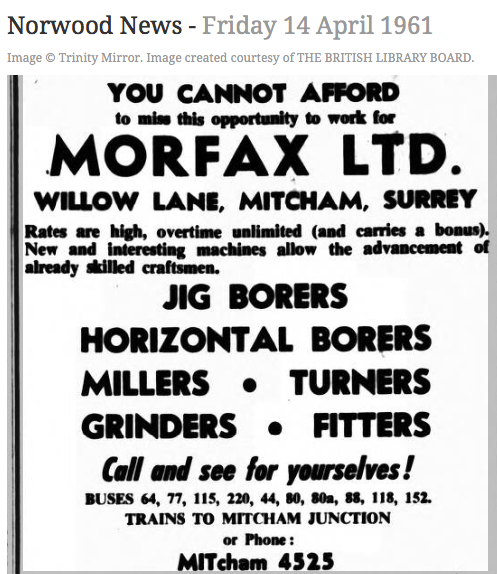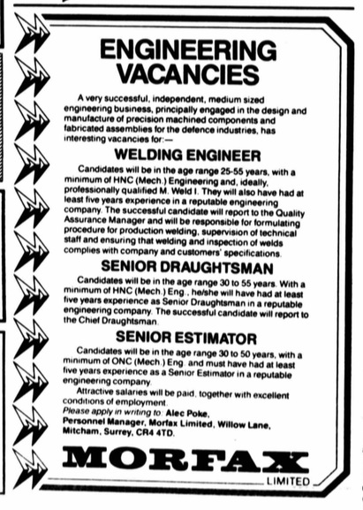 YOU CANNOT AFFORD to miss this opportunity to work for MORFAX LTD. WILLOW LANE, MITCHAM, SURREY Rates are high, overtime unlimited (and carries a bonus). New and interesting machines allow the advancement of already skilled craftsmen.
