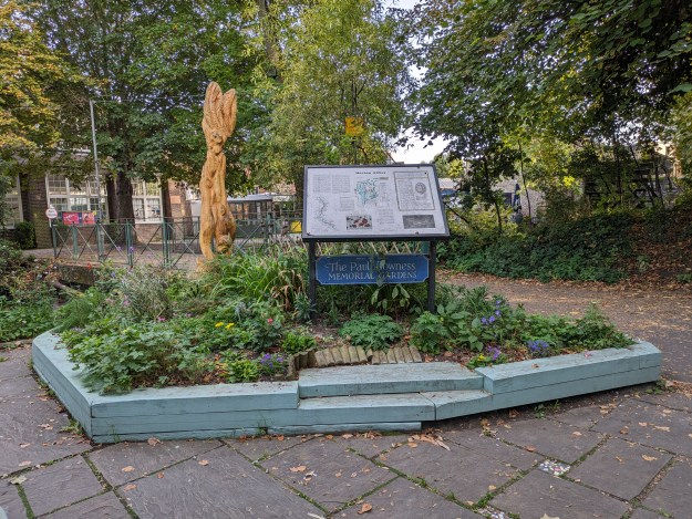 A small memorial garden, dedicated to Paul Bowness, near the north end of Abbey Mills where the footpath on the west side of the river Wandle meets the Merantun Road.