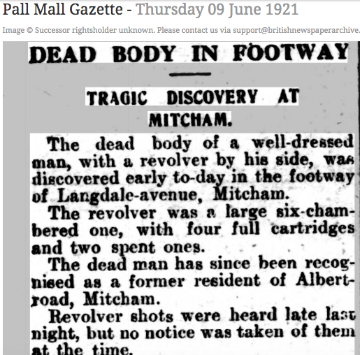 The dead body well-dressed man, with a revolver by his side, was discovered early to-day in the footway of Langdale-avenue, Mitcham. The revolver was a large six-chambered one, with four full cartridges and two spent ones. The dead man has since been recognised as a former resident of Albert-road, Mitcham. Revolver shots were heard late last night, but no notice was taken of them the time.