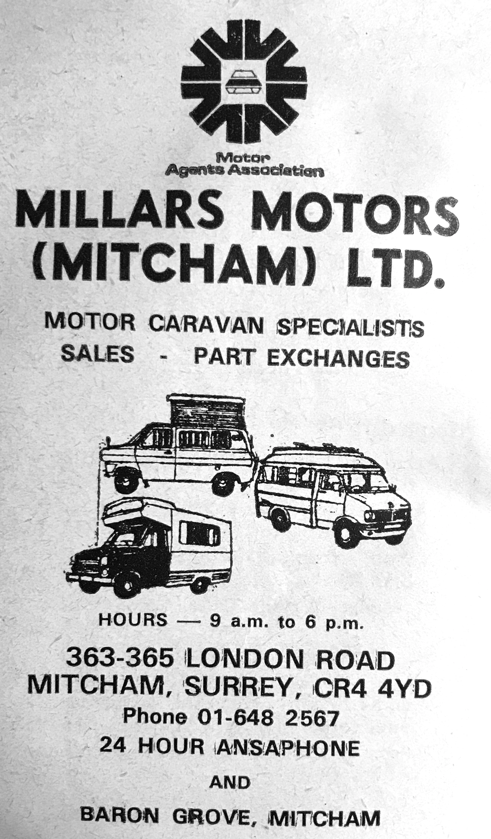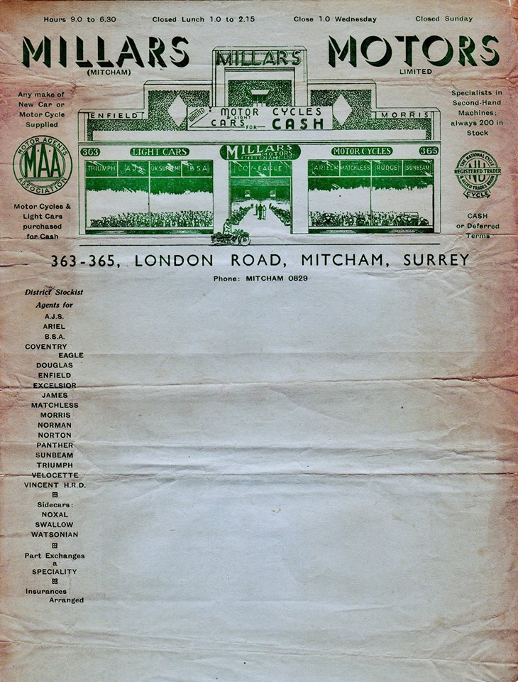 In 1954 phone book as Millars Motors (Mitcham) Ltd., Motor dealers, 363 London Road, telephone MITcham 0829.