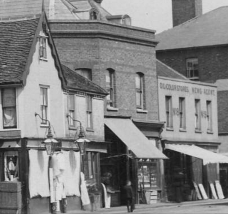 This clip of Mitcham ‘High Street’ as was called then, is from around 1900, and shows the left the old Kings Arms pub. Numbers 250 and 252 are to the left of the Oil Colour Stores’ that has ‘No. 8’ between the windows on the first floor.
