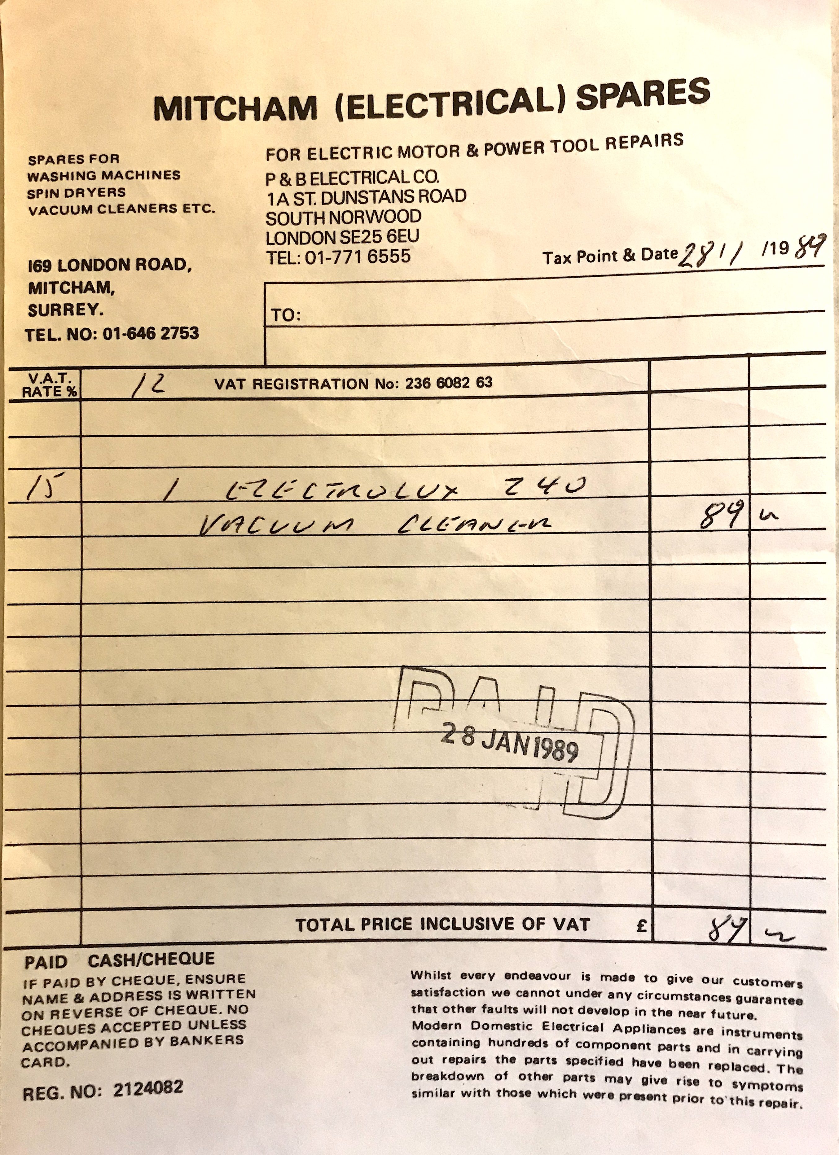 1989 receipt for vacuum cleaner bought from Mitcham (Electrical) Spares