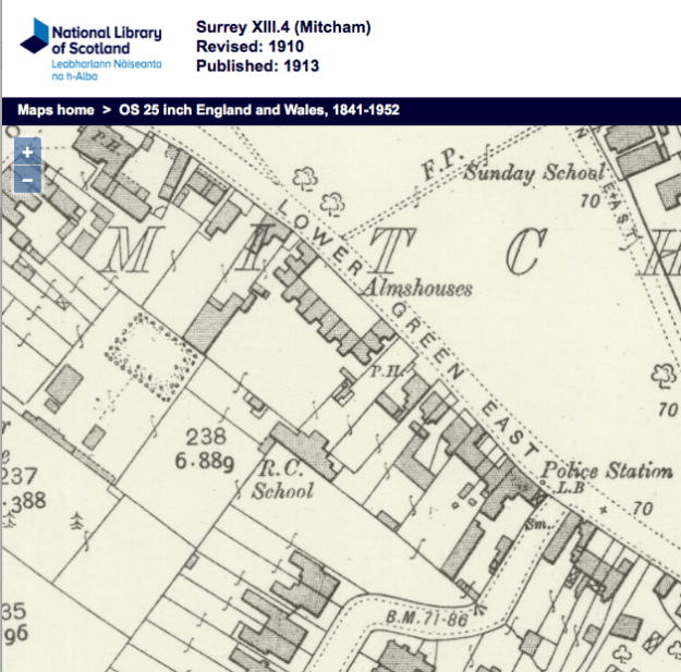 This OS map from 1910 shows the outline of the school building, its entrance being between the Almshouses and the Britannia pub shown as P.H.