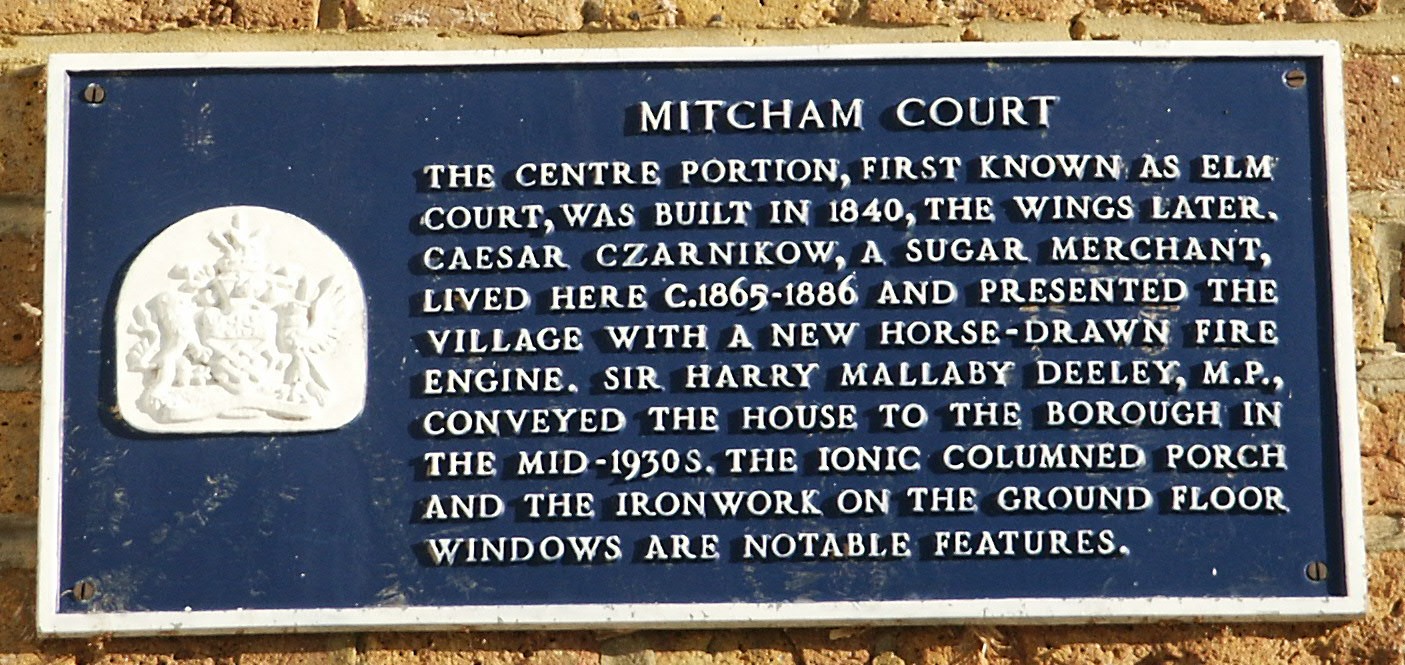 The centre portion, first known as Elm Court, was built in 1840, the wings later. Caesar Czarnikow, a sugar merchant, lived here c. 1865-1886 and presented the village with a new horse-drawn fire engine. Sir Harry Mallaby Deeley, M.P., conveyed the house to the borough in the mid-1930s. The Ionic columned porch and the ironwork on the ground floor windows are notable features.