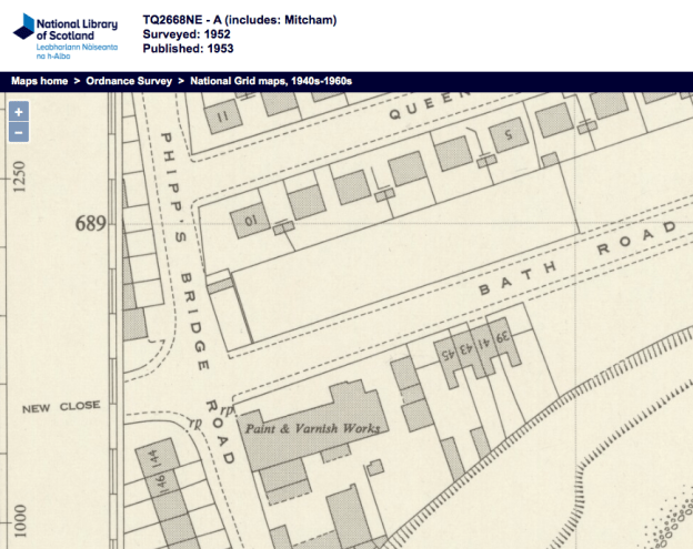 Aspinall’s Enamel Ltd expanded in 1914 to add a factory in Bath Road in 1914. It was presumably at the Phipps Bridge Road end, opposite where New Close is today, as shown on this 1952 OS map.