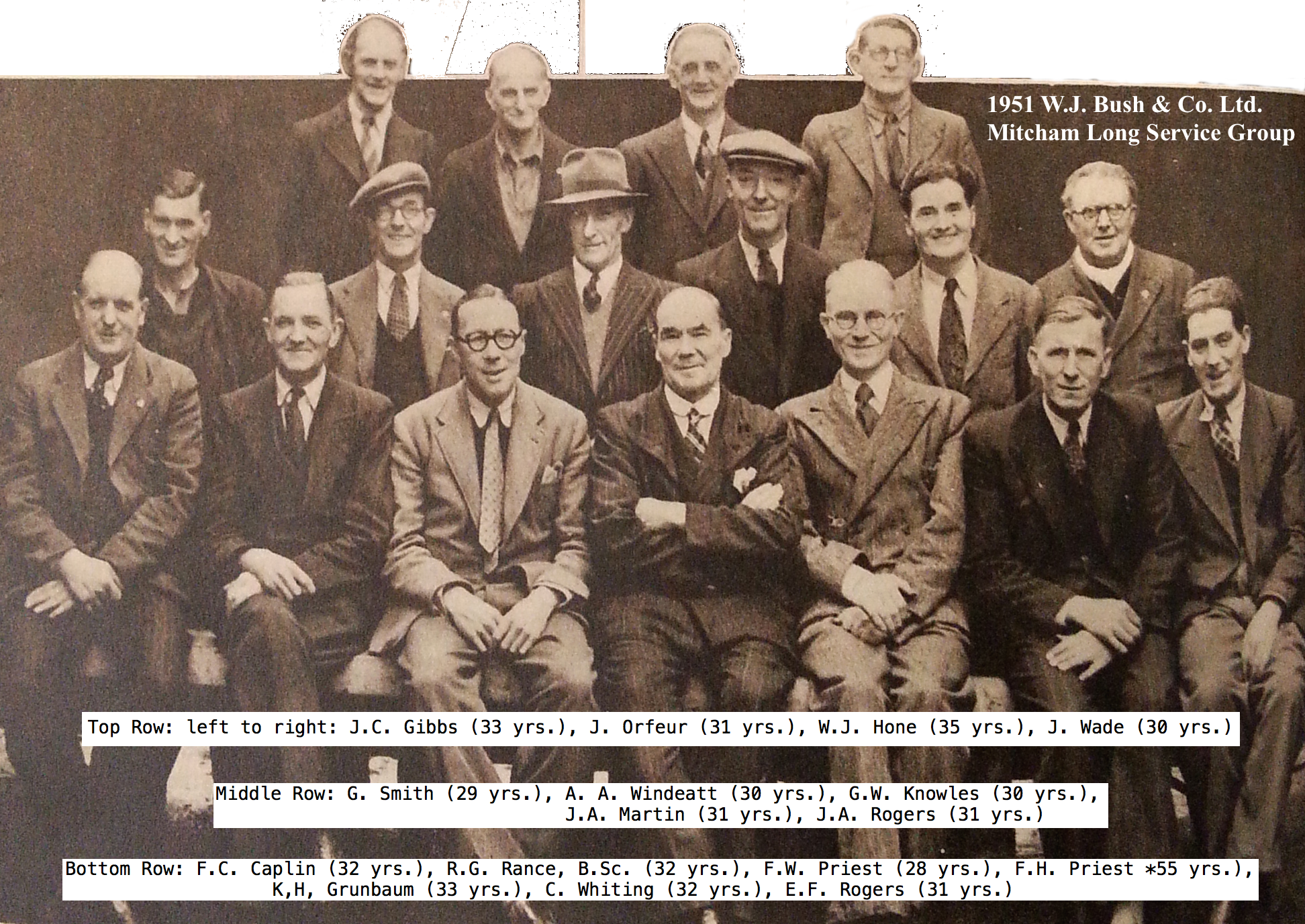 Bottom Row: F.C. Caplin (32 yrs.), R.G. Rance, B.Sc. (32 yrs.), Frederick William Priest (28 yrs.), Frederick Horace Priest (55 yrs.),K.H. Grunbaum (33 yrs.), C. Whiting (32 yrs.), E.F. Rogers (31 yrs.)