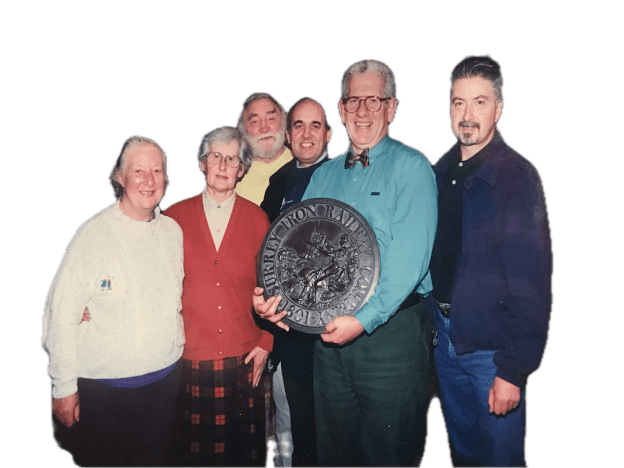 Mr Suttie’s talk at our last AGM about the Wandle Valley Project included details of the S.I.R which, from 1804, ran across the Common where we now have the Tramlink. The iron Railway was probably the first public railway in the world and the Committee decided that we would buy a commemorative plaque to mark the route. The plaque was presented to your Chairman and John Beaumont at a ceremony in Wandsworth by none other than David Bellamy and Adam Hart-Davis!