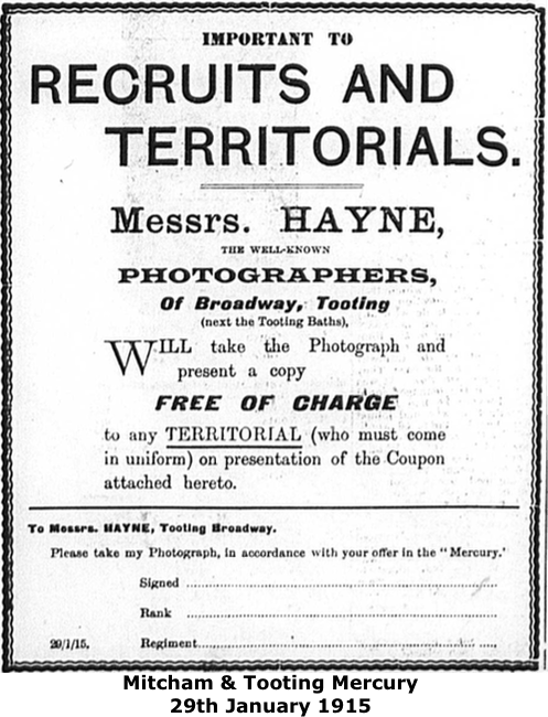 During World War 1, Arthur Hayne’s photographers shop in Tooting offered free portrait photos to recruits.