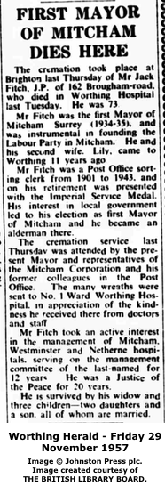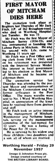 The late Mr. Sydney Gedge, of Mitcham Hall, a one-time Member of Parliament and constructor of Mitcham Park, is remembered in Gedge Court on the Baron House Estate opposite his old home. Mitcham’s first Mayor, then Ald. Jack Fitch, and Mr. J. R. Beaumont, also a former Mayor and alderman, are commemorated in Fitch and Beaumont Courts on the Laburnum Road Estate.
