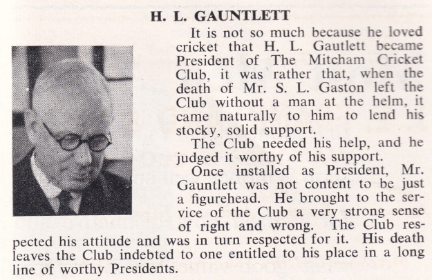 It is not so much because he loved cricket that H. L. Gautlett became President of The Mitcham Cricket Club, it was rather that, when the death of Mr. S. L. Gaston left the Club without a man at the helm, it came naturally to him to lend his stocky, solid support.