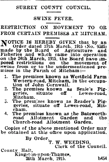Although not named as belonging to Henry Woods, that these allotments were used for piggeries can be seen in the swine fever notice from 1915: