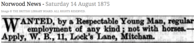WANTED, by a Respectable Young Man, regular employment of any kind ; not with horses.— Apply, W. B., 11, Lock’s Lane, Mitcham.