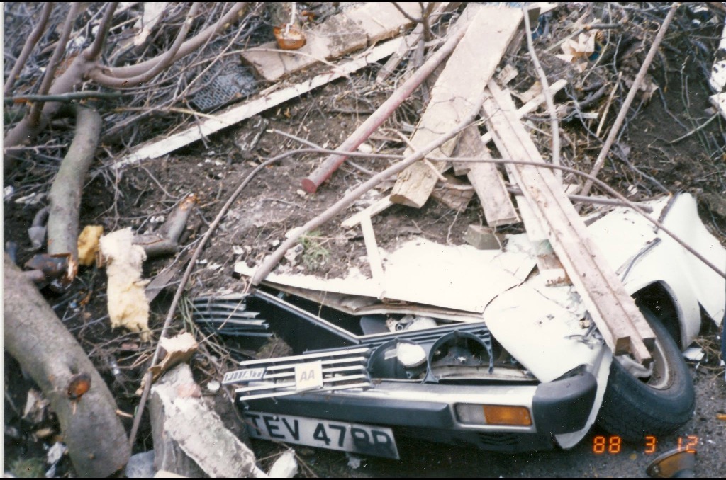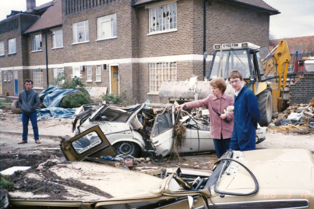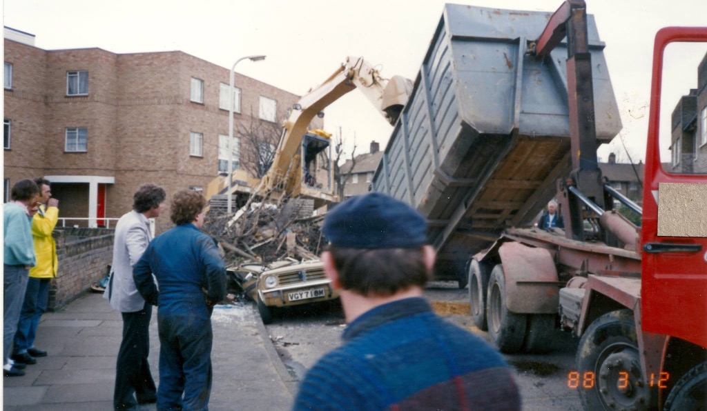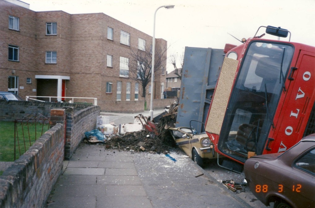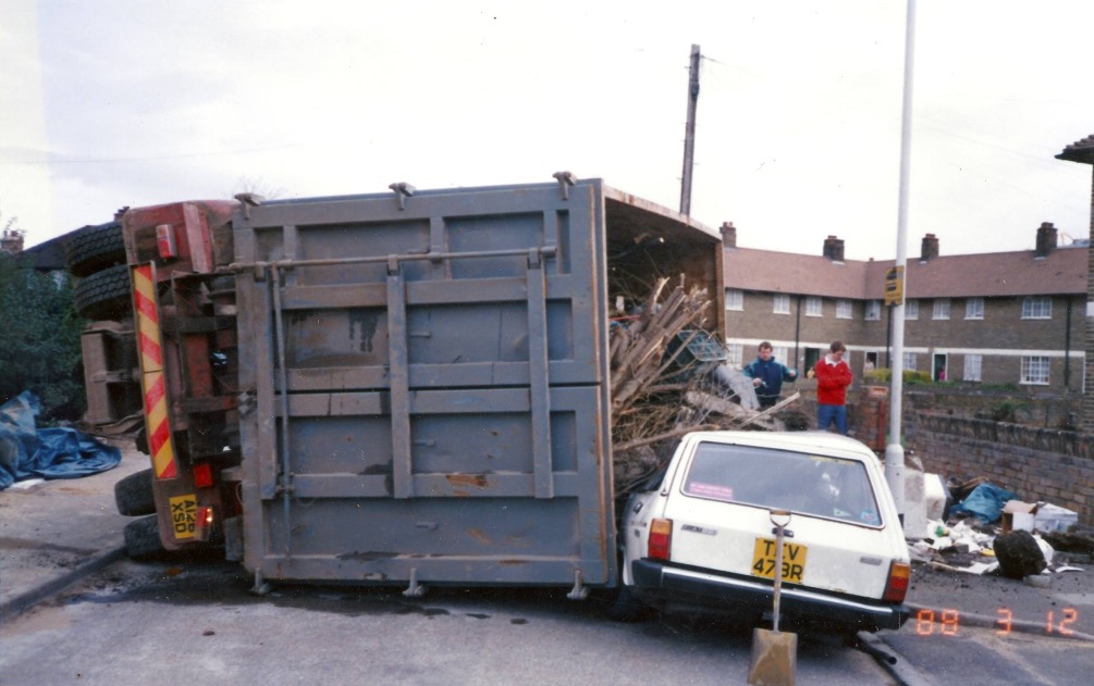 In March 1988, the houses were being renovated, which included converting the ‘sunshine patios’ to an extra bedroom, when a skip lorry overturned crushing some cars. Thanks to Keith and Marie Drake for these photos.