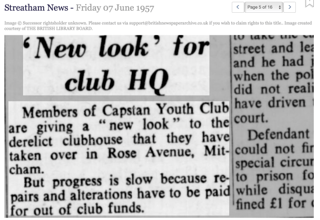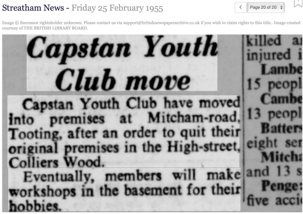 Capstan Youth Club have moved into premises at Mitcham-road, Tooting, after an order to quit their original premises in the High-street, Colliers Wood. Eventually, members will make workshops in the basement for their hobbies.
