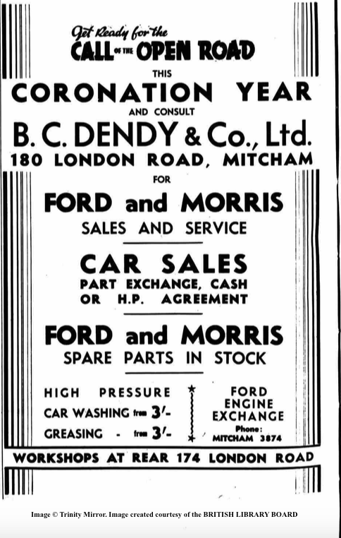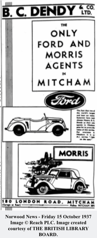 MITCHAM’S SOLE AGENTS B. C. Dendy and Co.. Ltd., 180, London-road, Mitcham, has an advantage over other motor-dealers in Mitcham as he is the only agent in Mitcham for Morris and Ford cars. This advantage is also an advantage for prospective buyers of cars residing within easy reach of Mitcham, as one is able to see the car one wants in comfort.