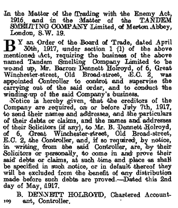 1917: Tandem Smelting Co. wound up under the Trading with the Enemy Act, and the site sold at auction, and bought by the Eyre Smelting Co.