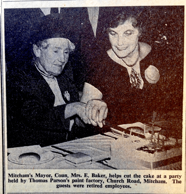 Mitcham’s Mayor, Coun, Mrs E. Baker, helps cut the cake at the party held by Thomas Parson’s paint factory, Church Road, Mitcham. The guests were retired employees.