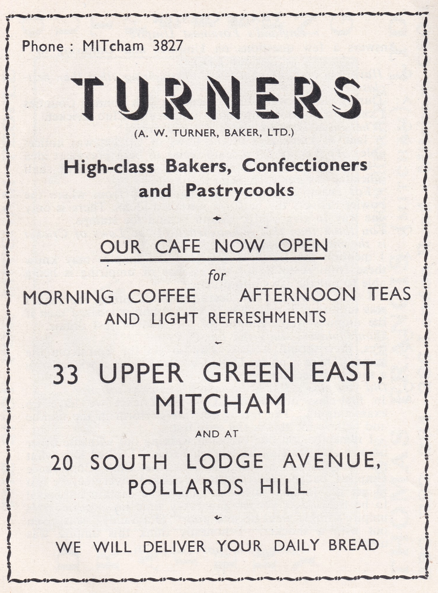 Bakery that was at 33 Upper Green East, where they had a shop and, up to the 1970s, did deliveries around Mitcham by horse and cart. The Turner family had been in the bakery business for almost 200 years.