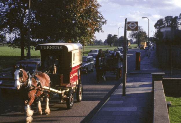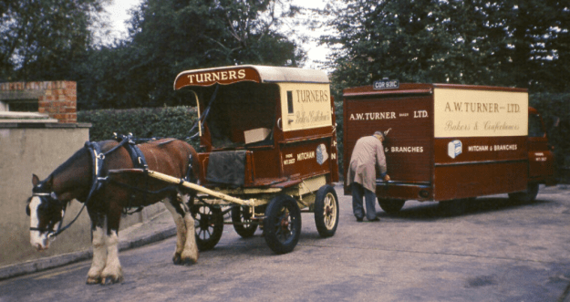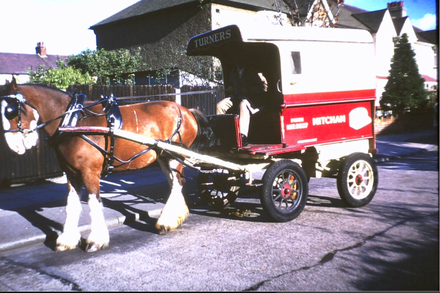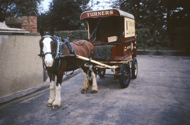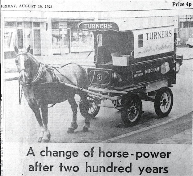 The firm have always used horses for deliveries to customers, although a fleet of vans has also covered routes between the four shops in the Mitcham area. Recently Turners, a family business since 1792, was taken over by Spillers.