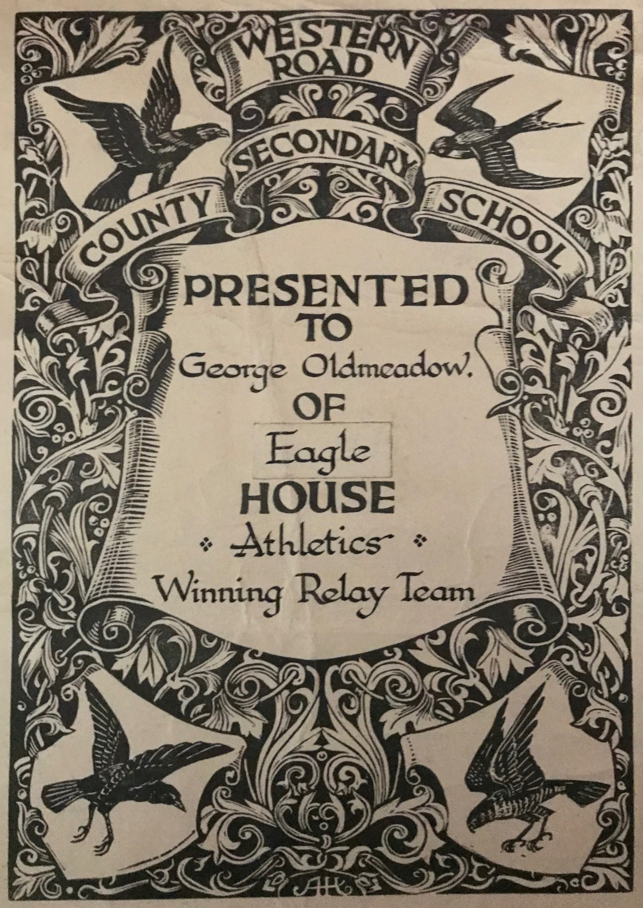 George has also provided his athletics certificate, which shows he was in ‘Eagle’ house. The boys school was divided into 4 houses. During the 1940s these were named Eagle, Hawk, Raven and Swift. In the 1950s these were changed to Graveney, Ravensbury and two others.