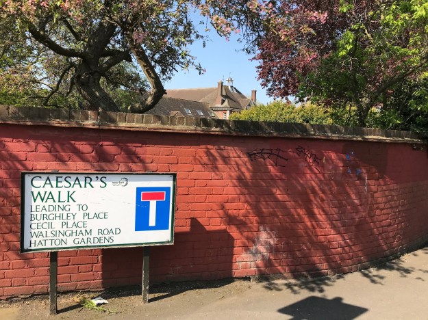 The name of the road refers to Sir Julius Caesar Adelmere who, it was believed, had a mansion on the site where the Wilson Hospital is now. In 1598 he entertained Queen Elizabeth I. From this the names of the roads off of Caesars Walk are related to that monarch.